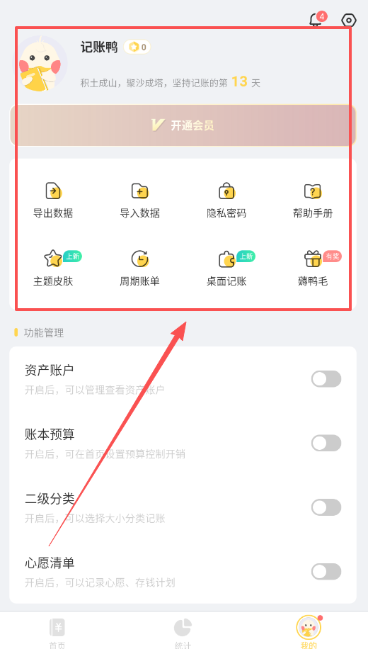 1、首先呢,打开记账鸭 app,在首页底部导航栏选择“我的”,进入功能管理页面,记账时就能选择更具体的大小分类了。