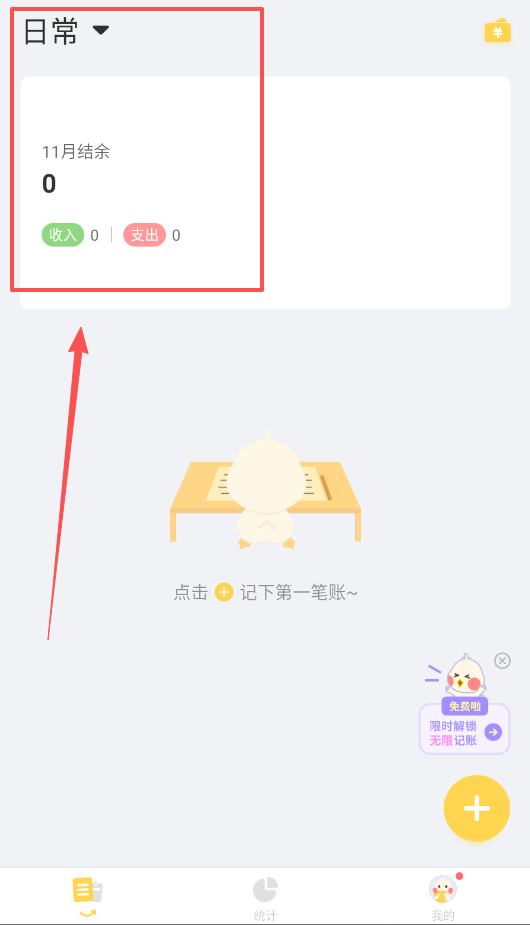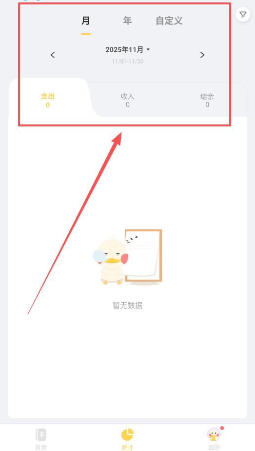3、然后啊,如果你想知道这个月的花费情况,就点开底部导航的“统计”页面,默认是月视图,目前没有数据的话记几笔账就能看到变化了。