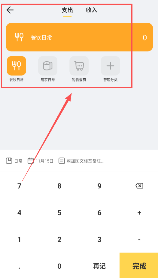 2、接着呢,想记下第一笔账,就回到首页的“日常”选项卡,点击页面中间的“点击记下第一笔账”提示区域,最后点完成就行。