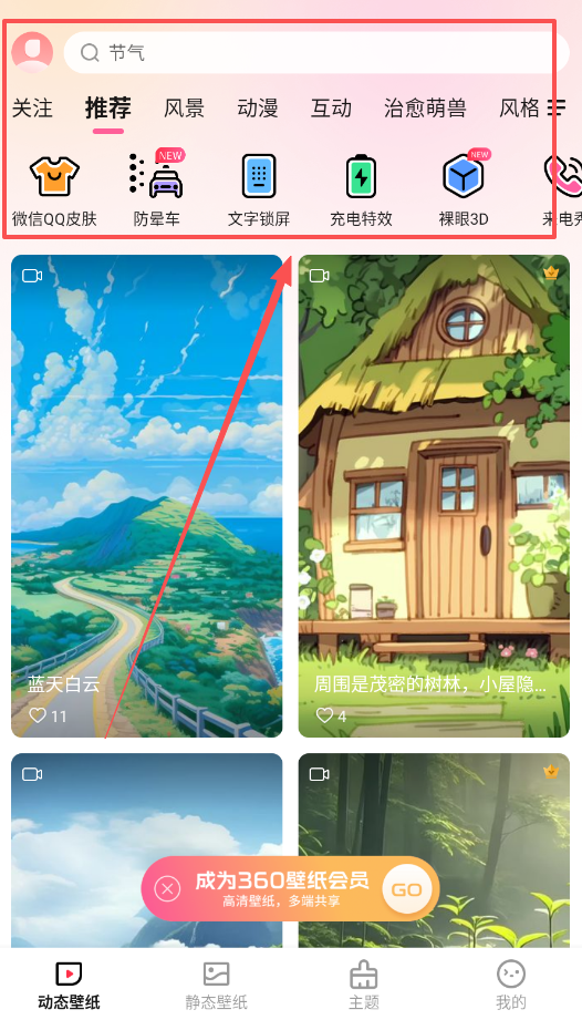 2、在节气栏目中选择关注、推荐或风格等标签,比如找到蓝天白云这类壁纸,同时会员可以免费使用防晕车、充电特效等特色功能。