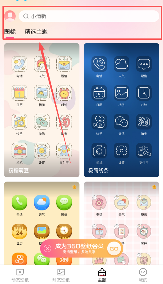 3、更换图标时先进入精选主题页面,浏览粉桶萌豆、极简线条等风格,接着选择电话、日历等应用的图标套装。