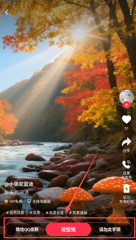 4、遇到喜欢的壁纸如秋天的河流时,或设置为手机壁纸、来电秀和充电特效,电脑版用户还能同步使用同款壁纸。
