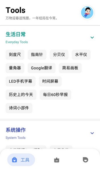 《七点工具箱最新版》这个版本提供了更好的工具功能服务,给所有用户带来了工具箱的最新体验,软件界面简单易用,使用起来也非常简单方便。每天的财富可以帮助每个人轻松地过好每一天。它可以给用户的日常生活、学习和工作带来极大的便利。无论是在日常生活还是办公中,而且软件都可以用来解决问题,使用起来非常方便。它不仅体积轻、界面简单直观、功能模块丰富,还将日常生活和体验融合在一起。