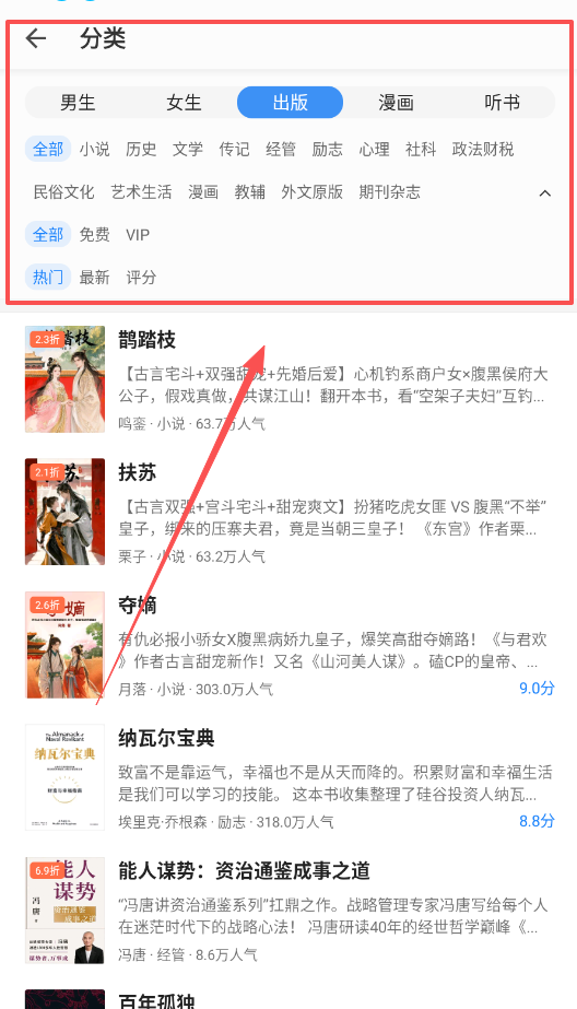 1、首先呢,打开掌阅App,在首页底部导航栏找到并点击“书城”。在这里你可以通过顶部的“分类”或“排行榜”来筛选书籍。