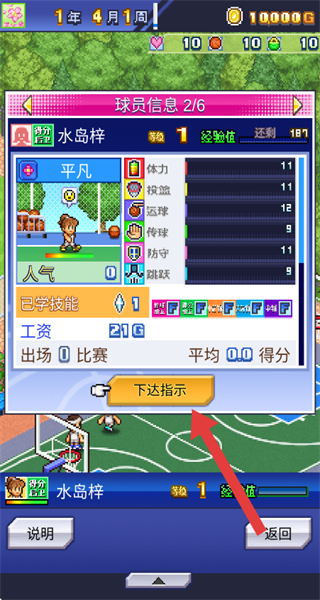2、在球员信息界面,点击下达指示按钮,弹出操作菜单。