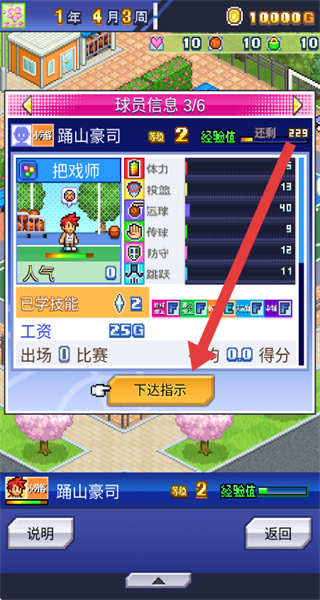 2、在球员信息界面,点击下达指示按钮,弹出操作菜单。