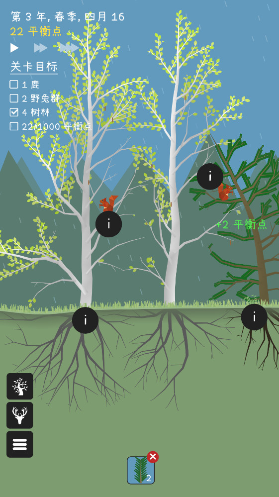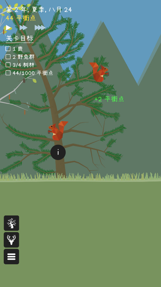 小松林是一款结合生态系统构建与自然模拟的治愈系策略游戏,玩家将扮演一名森林守护者,致力于建立并管理一片独特的森林生态。玩家可以通过点击动物来观察它们的行为,这些行为会直接影响森林的生长。比如狐狸狩猎时维持着食物链的稳定,而松鼠搬运坚果则帮助散播种子,促进植物的繁殖。玩家还需应对突如其来的自然灾害,如暴风雨、火灾等,这些挑战将考验玩家的应变能力和管理技巧。