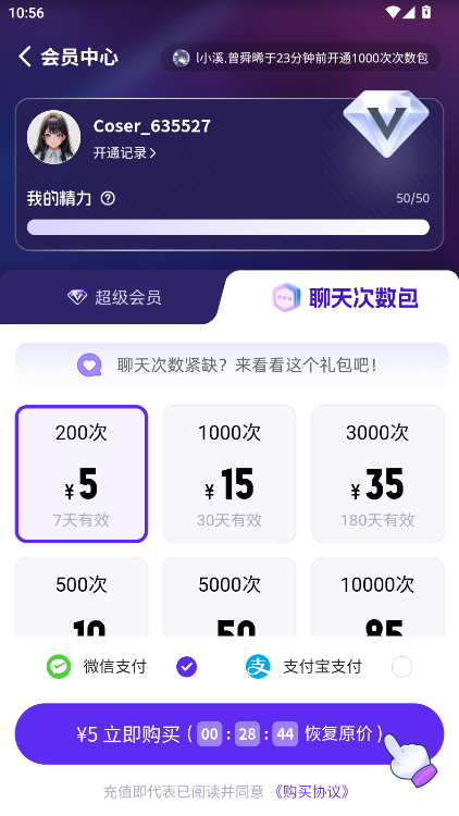 3、购买我们想过要的套餐即可获得精力了。