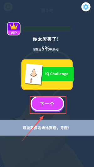 3、然后,若屏幕弹出“VIP 你太厉害了!智慧比5%玩家的!”恭喜界面,表示你已突破瓶颈,可点击继续向更高难度挑战。