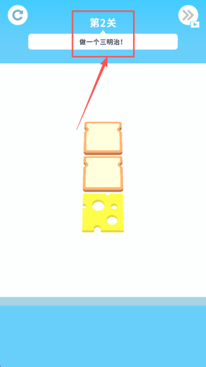 4、最后,来到“第2关 做一个三明治!”时,按照顺序把食材拖入指定区域组合成三明治,正确完成后即可解锁下一关。