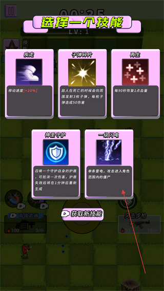3、升级时选择技能如一触即电,利用范围攻击效果,快速清理大量怪物。