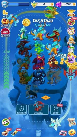 巨龙进化最佳合并闲人以魔法世界为背景的放置合成游戏。您需要将龙蛋、幼龙与各类生物进行组合,通过不断合成获得更高级的物种。游戏借助魔法设定让您探索各个神秘岛屿,在轻松简单的合并过程中体验培育与进化的乐趣。