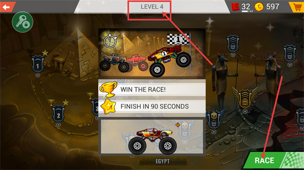 1、选择【LEVEL-4】点击【RACE】开始游戏,需完成【WIN-THE-RACE】并在90秒内结束,开启埃及场景的竞速挑战。