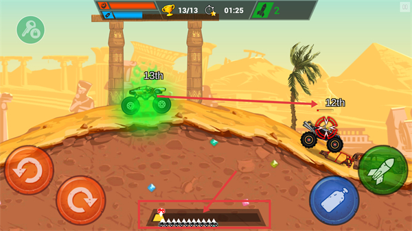 2、在埃及赛道中,留意下方陷阱,攻击【12th】车辆,利用右侧【火箭】【加速瓶】道具提升排名,应对对手挑战。