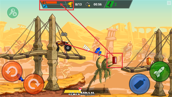 3、关注上方血量,收集红色道具恢复状态,在吊桥场景中推进,同时利用道具提升车辆性能,保持良好竞技状态。