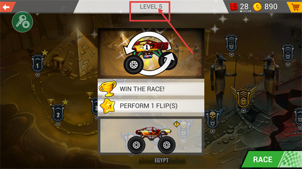4、选择【LEVEL-5】点击【RACE】开始游戏,需完成【WIN-THE-RACE】并执行1次翻转,继续埃及场景的冒险挑战。