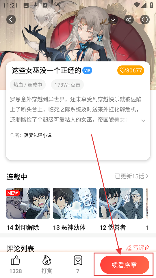 2、进入漫画详情页后,点击【续看序章】,可进入漫画序章阅读页面,开始阅读漫画哦。