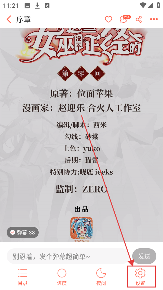 3、在漫画序章阅读页面,点击【设置】,可弹出设置选项,调整阅读相关设置啦。