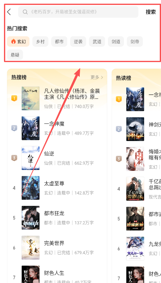 3、如果你想找特定小说,可以点击顶部的搜索图标,在搜索框输入书名、笔名或关键词,系统会显示热门搜索和历史记录。