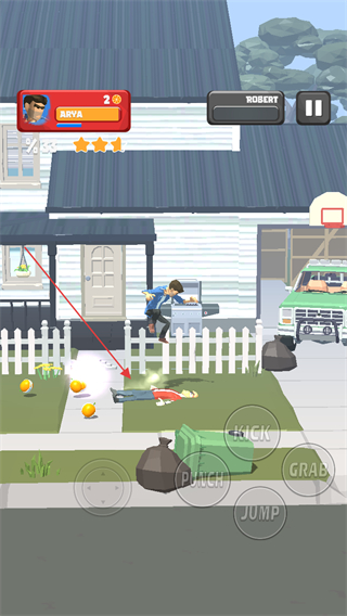 1、在居民区场景中,操控角色移动,利用攻击按钮如PUNCH与敌人战斗,注意上方血条和等级。