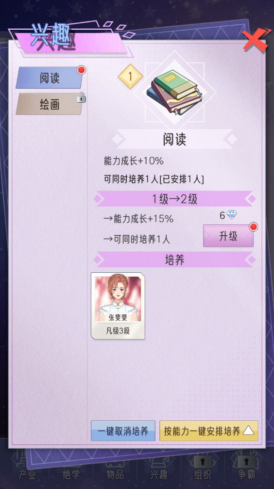 3.点击【兴趣】板块,可培养角色阅读、绘画等兴趣,能提升能力成长,可通过升级兴趣来提高加成效果,高效提升家族成员能力。