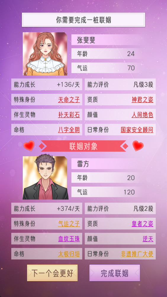 1.进入游戏后,先确认个人资料,包括姓名、年龄、气运、能力成长等属性,还可选择特殊身份、资质等设定,选好后点击【确定】正式开启游戏,你的使命是建立豪门、称霸上京、铸就百年荣光。