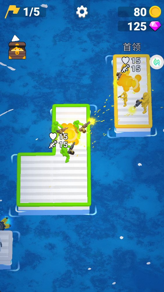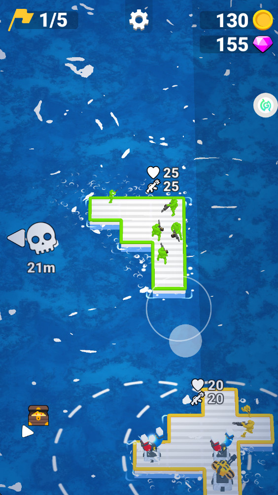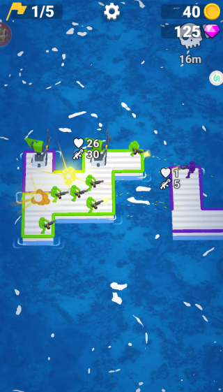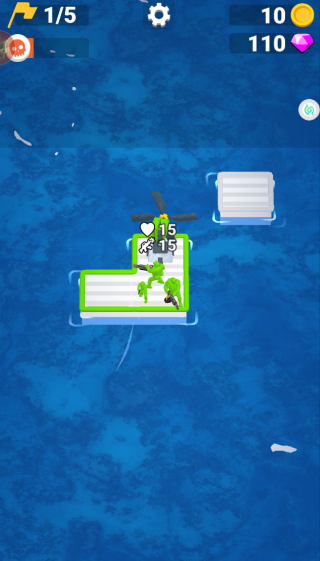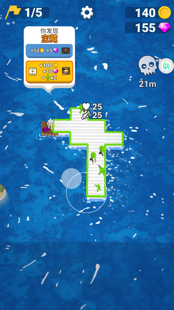 2.控制木筏开始移动,拾起海中的金币和钻石,建造你的射击塔,射击对方敌人。