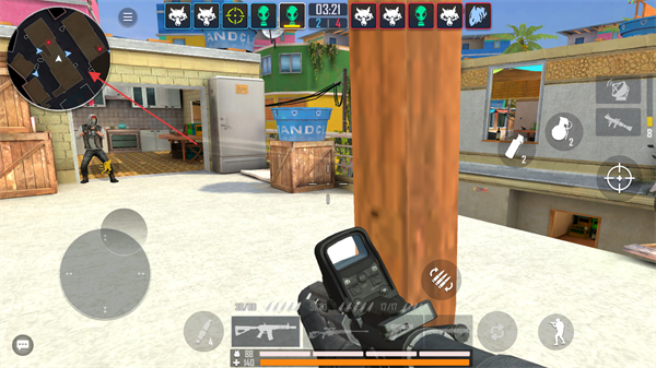 1、利用小地图观察敌人位置,借助柱子等掩体掩护,伺机发起攻击。