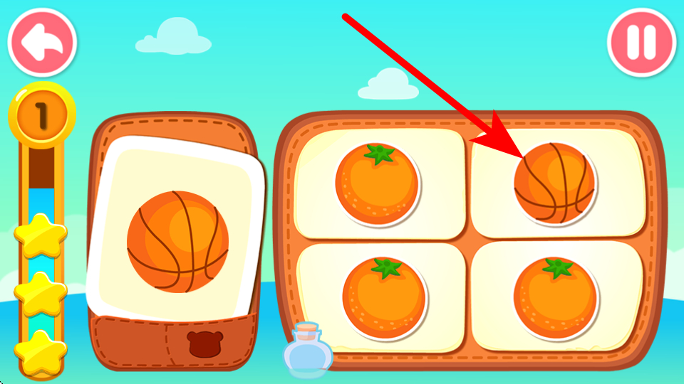 2、在配对关卡中,观察左侧目标图案如篮球,在右侧图案区域找到相同的篮球并点击,通过匹配相同物品推进关卡,确保配对准确。