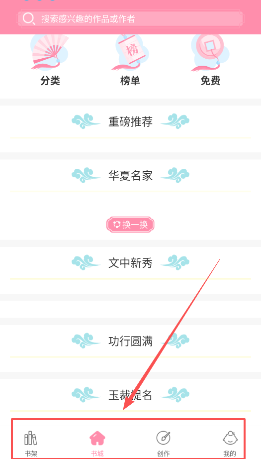 2、想找书的话就进入书城页面,顶部有搜索框可以直接输入作品或作者名,也可以通过分类、榜单和免费等标签筛选。