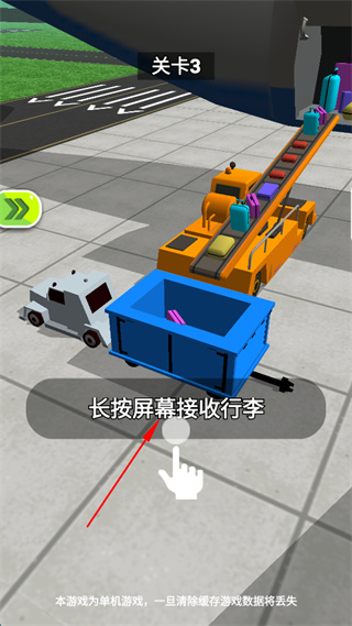 2、长按屏幕接收行李,使行李进入蓝色容器内,完成行李接收操作。