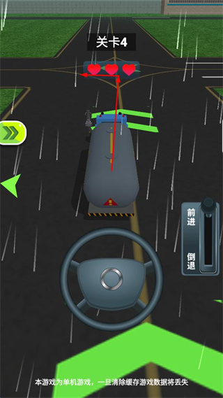 4、操作方向盘控制油罐车方向,操作前进倒退杆控制油罐车移动,沿着绿色箭头指示路径在雨天行驶。
