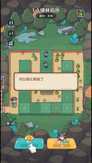 3、点击蓝色强化按钮可消耗金币提升战力,在金币充足或怪物进攻压力较大时使用,有效增强防御能力。