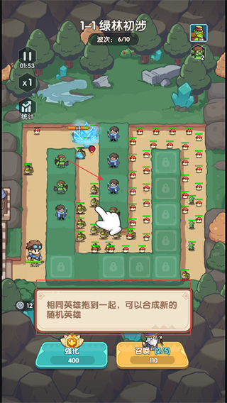 4、将相同英雄拖拽到一起可合成新的随机英雄,合成后英雄战力大幅提升,建议在怪物波次间隙进行合成以优化阵容。