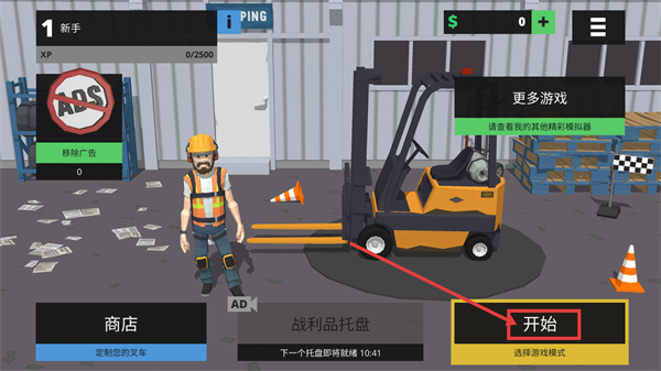 1、点击【开始】按钮选择游戏模式,以【新手-XP-0/2500】身份开启叉车模拟任务,驾驶叉车进入游戏场景。