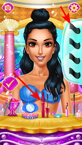 2、在化妆环节,选择右侧的睫毛样式,搭配下方的化妆品如口红,为美人鱼打造专属妆容,通过多样的化妆元素塑造独特形象。