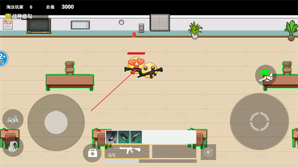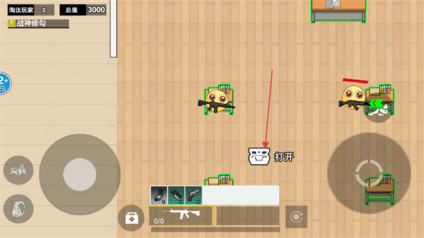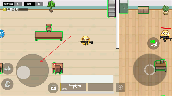 1、使用左侧虚拟摇杆移动角色,在校园场景中探索,寻找武器和资源。