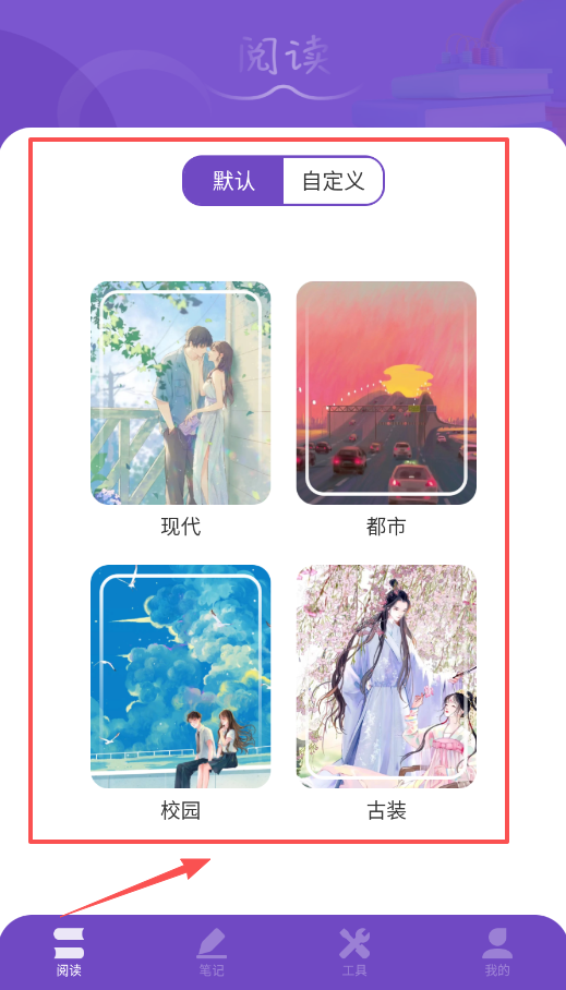 1、当你准备沉浸式读书时,就进入“阅读”界面选择“古装”或“校园”类内容,营造一个专属的阅读场景吧。