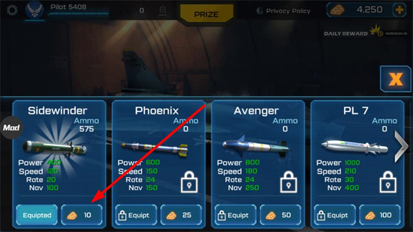 2、在武器选择界面中,挑选想要购买的导弹,如Sidewinder导弹,点击其下方的购买按钮。