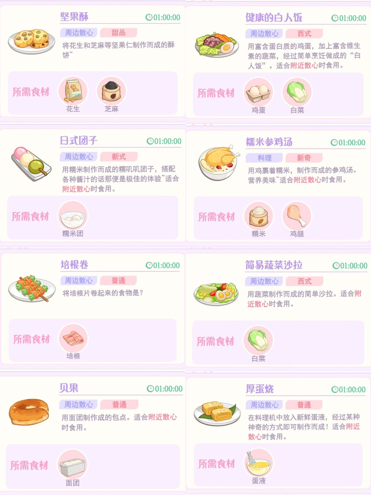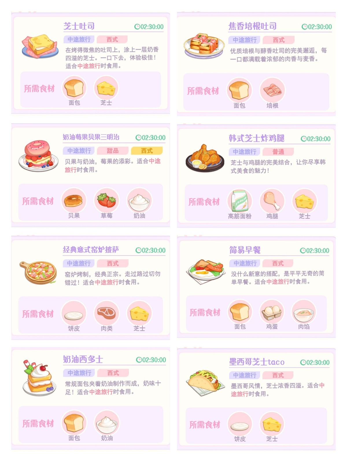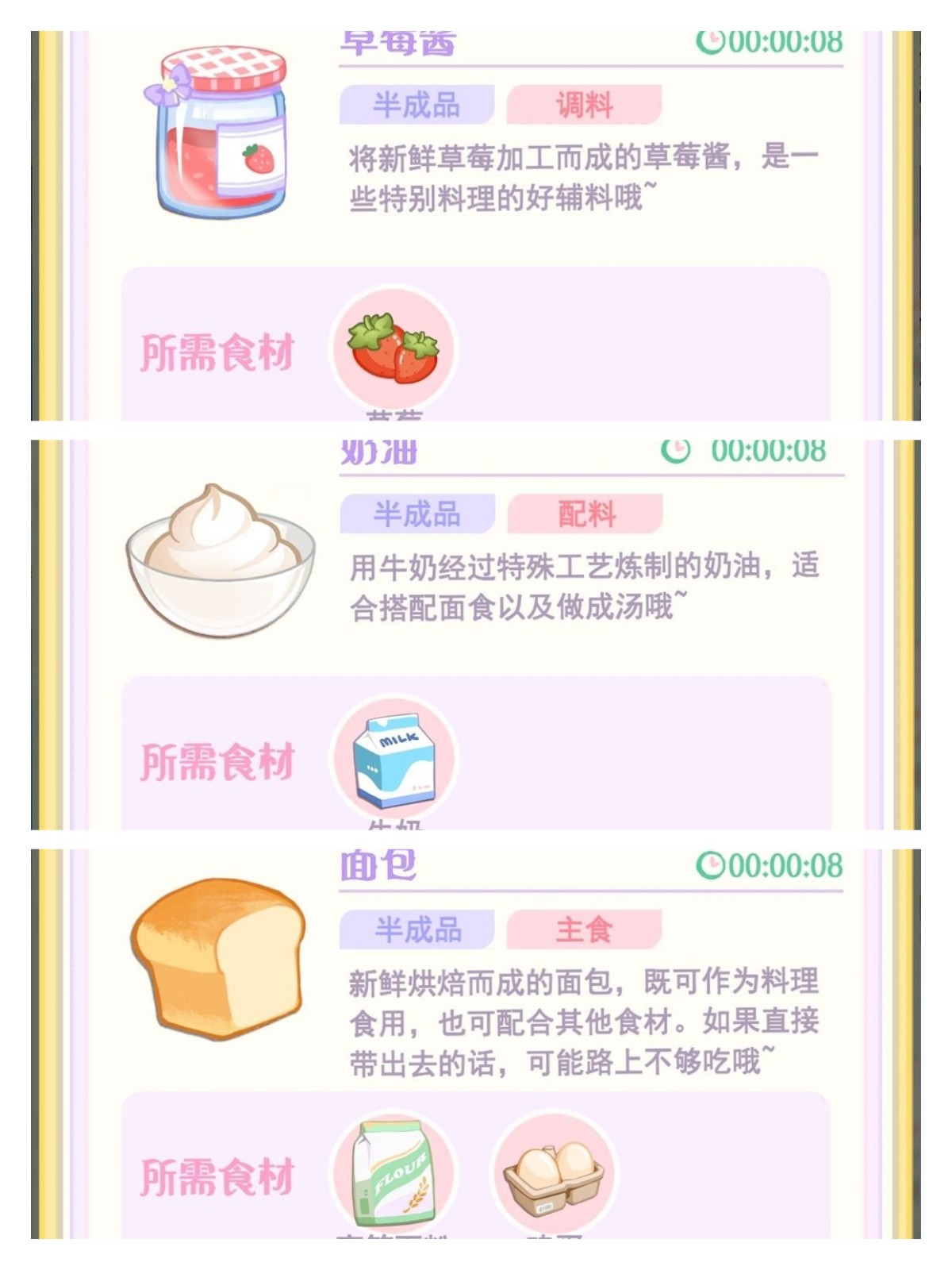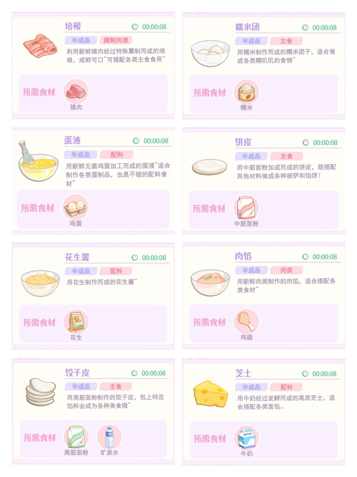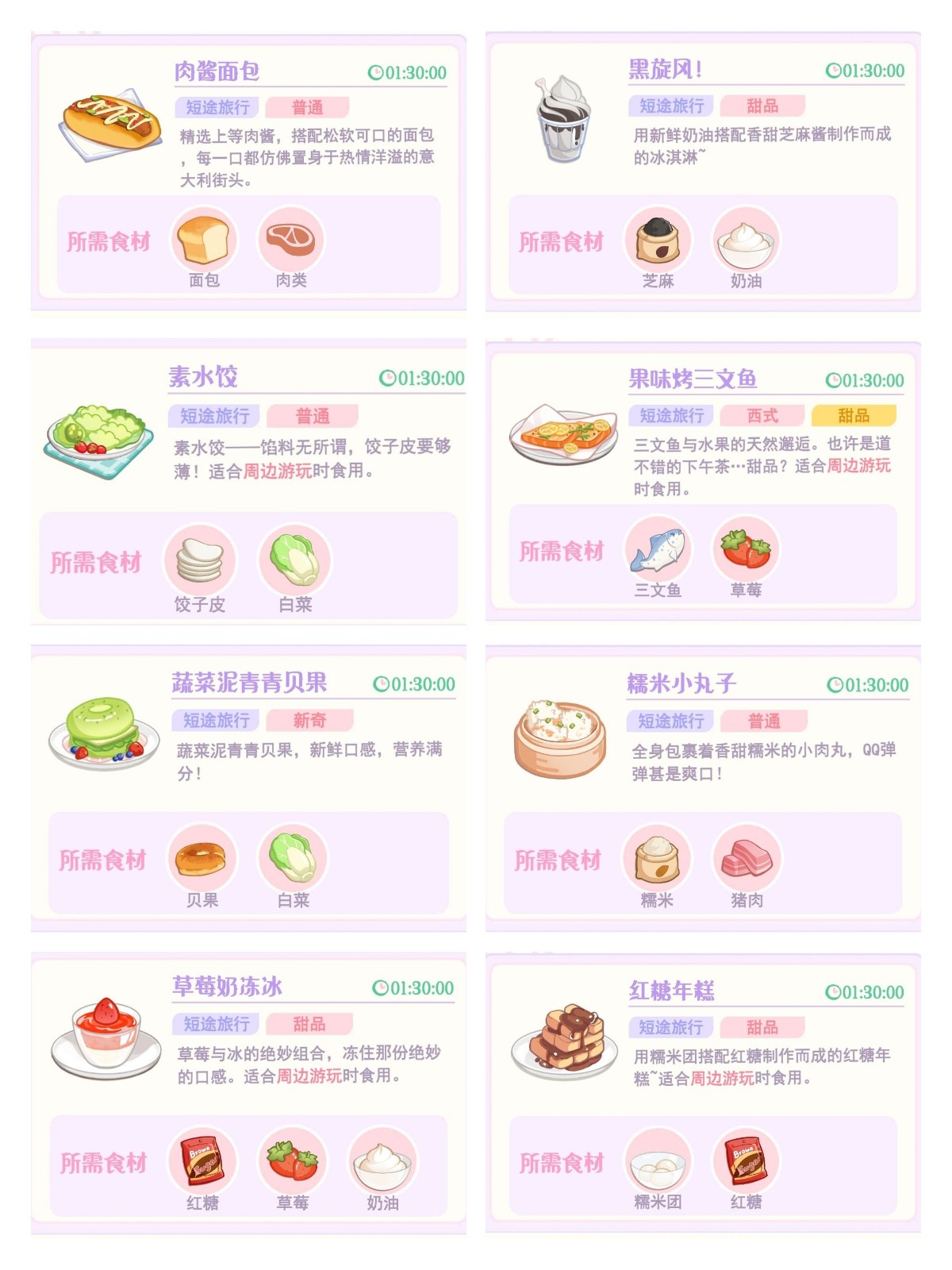 游戏中提供了多种不同的菜谱,包括半成品和完整料理。半成品是指不能直接携带,需要二次加工的食物;而完整料理则可以给角色带上。需要注意的是,烹饪一次可能需要数小时,并且某些食材会用到半成品。