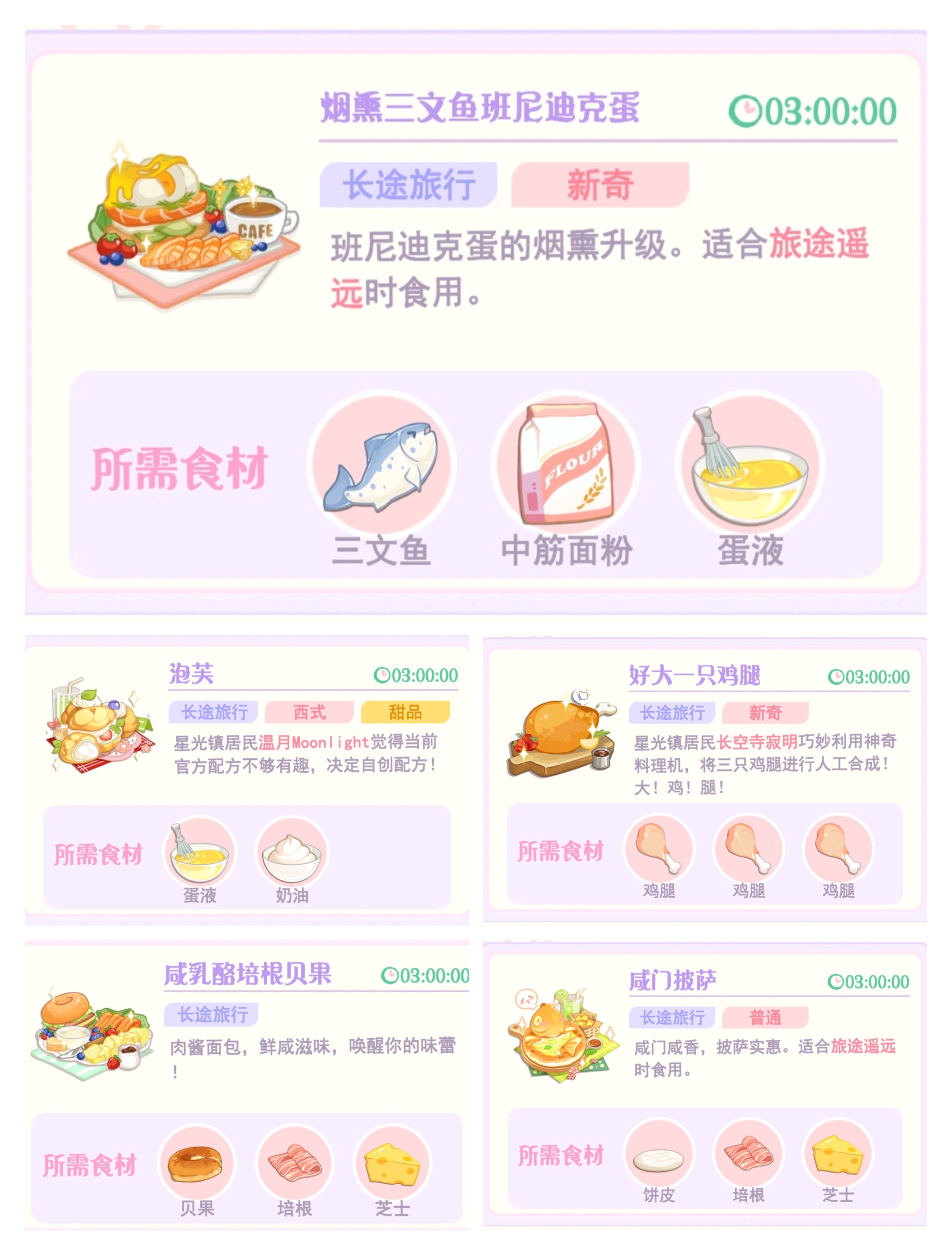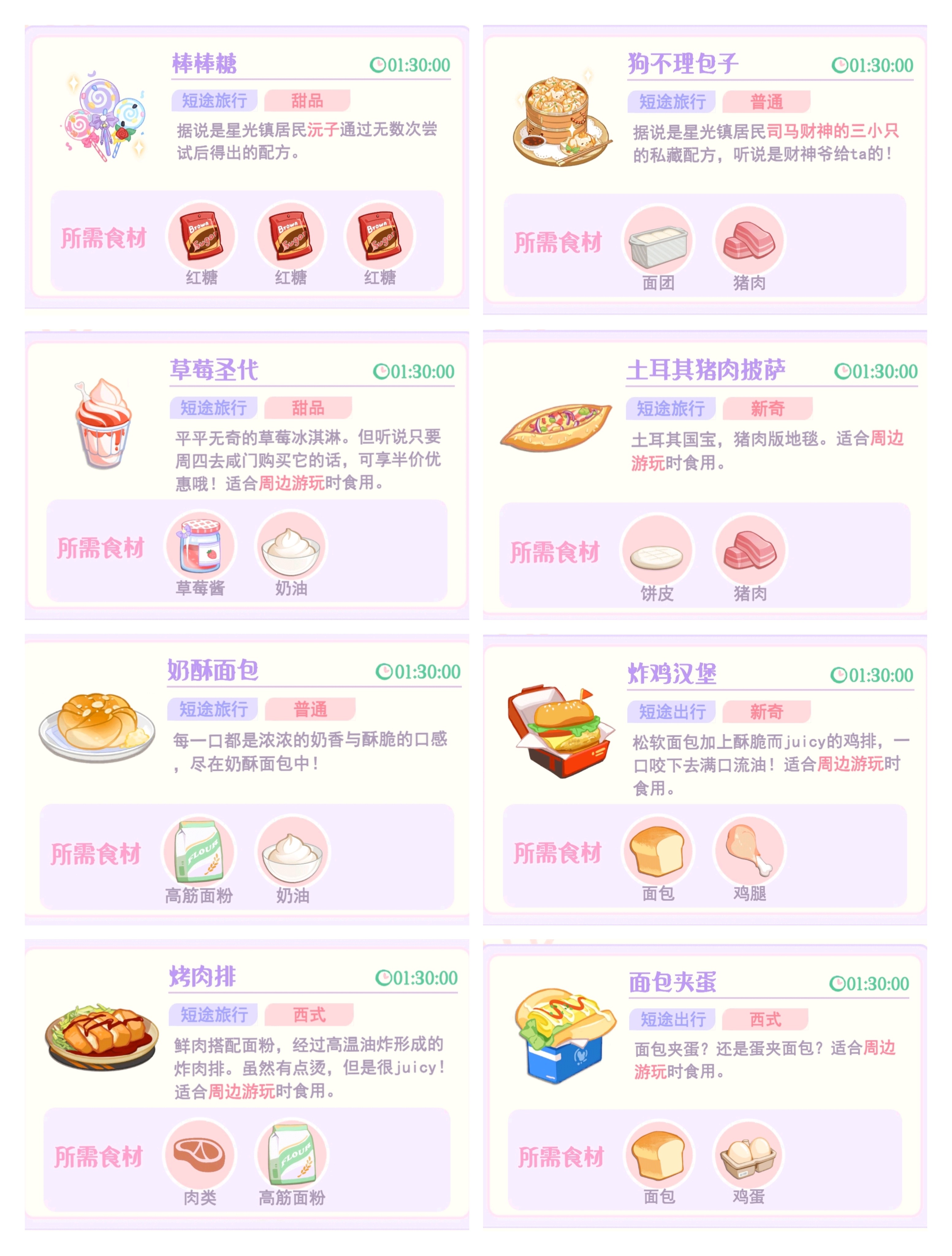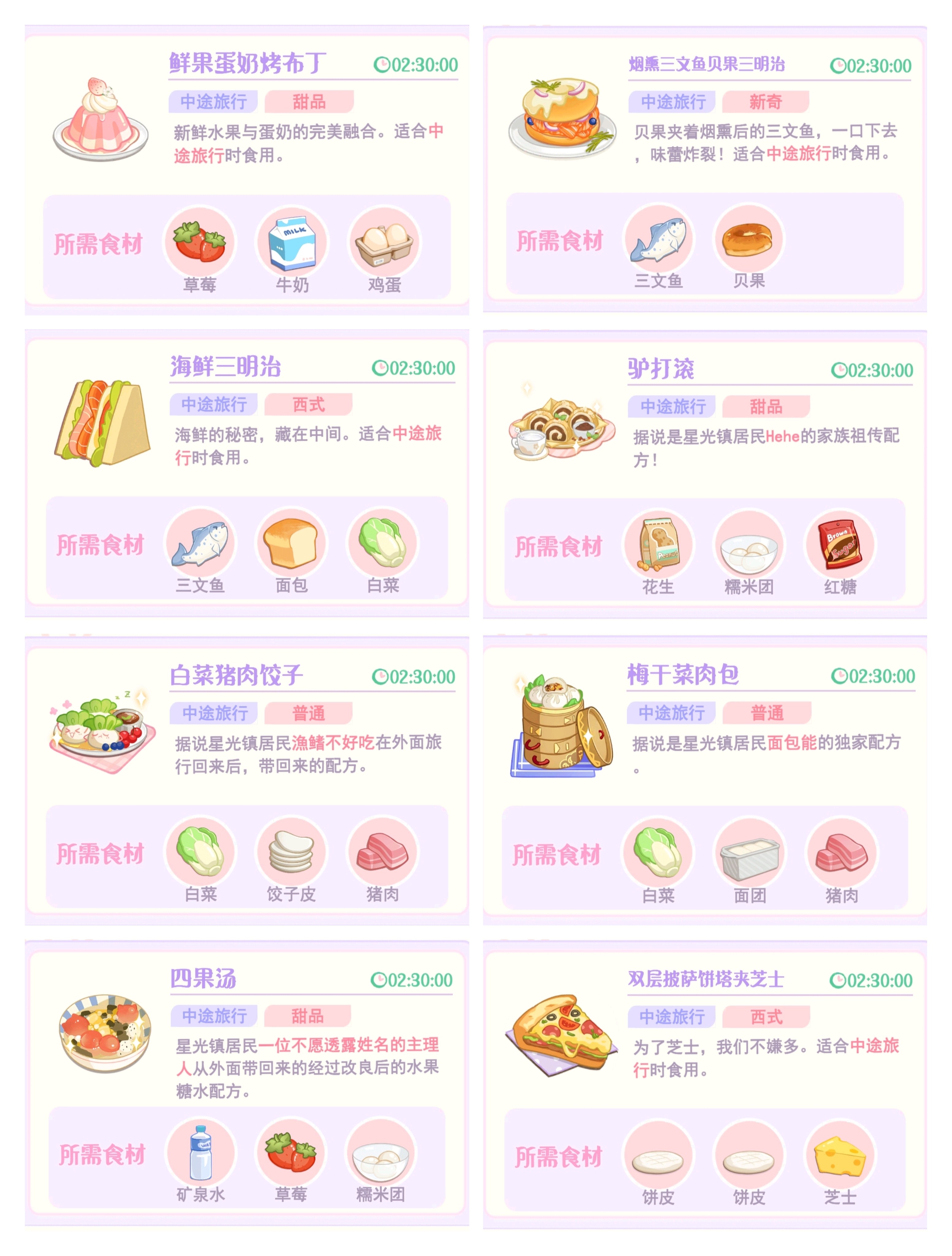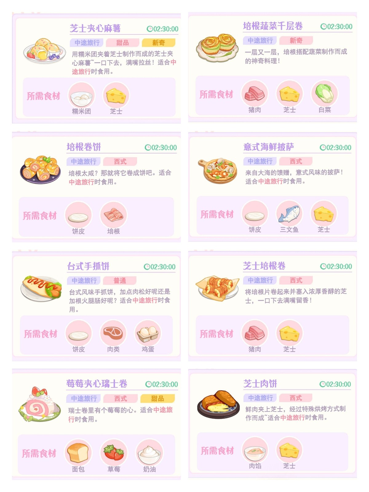 游戏中提供了多种不同的菜谱,包括半成品和完整料理。半成品是指不能直接携带,需要二次加工的食物;而完整料理则可以给角色带上。需要注意的是,烹饪一次可能需要数小时,并且某些食材会用到半成品。