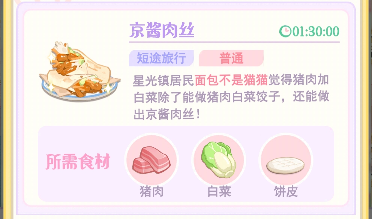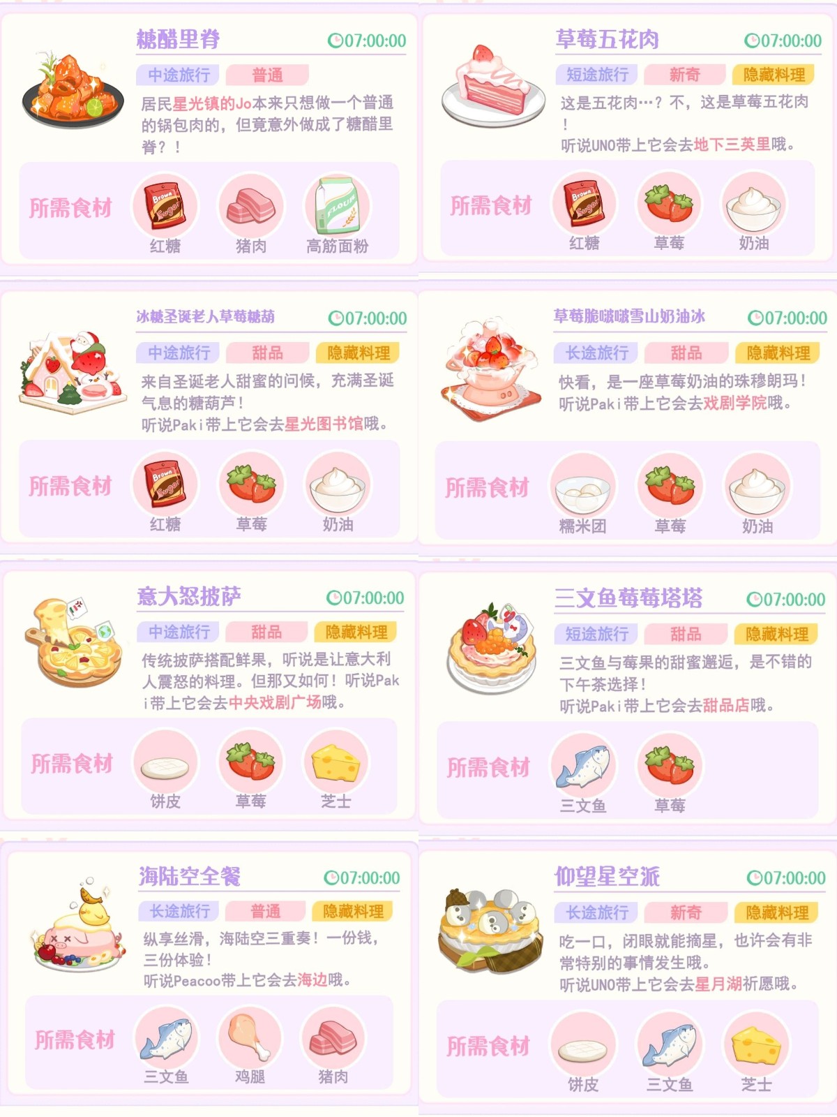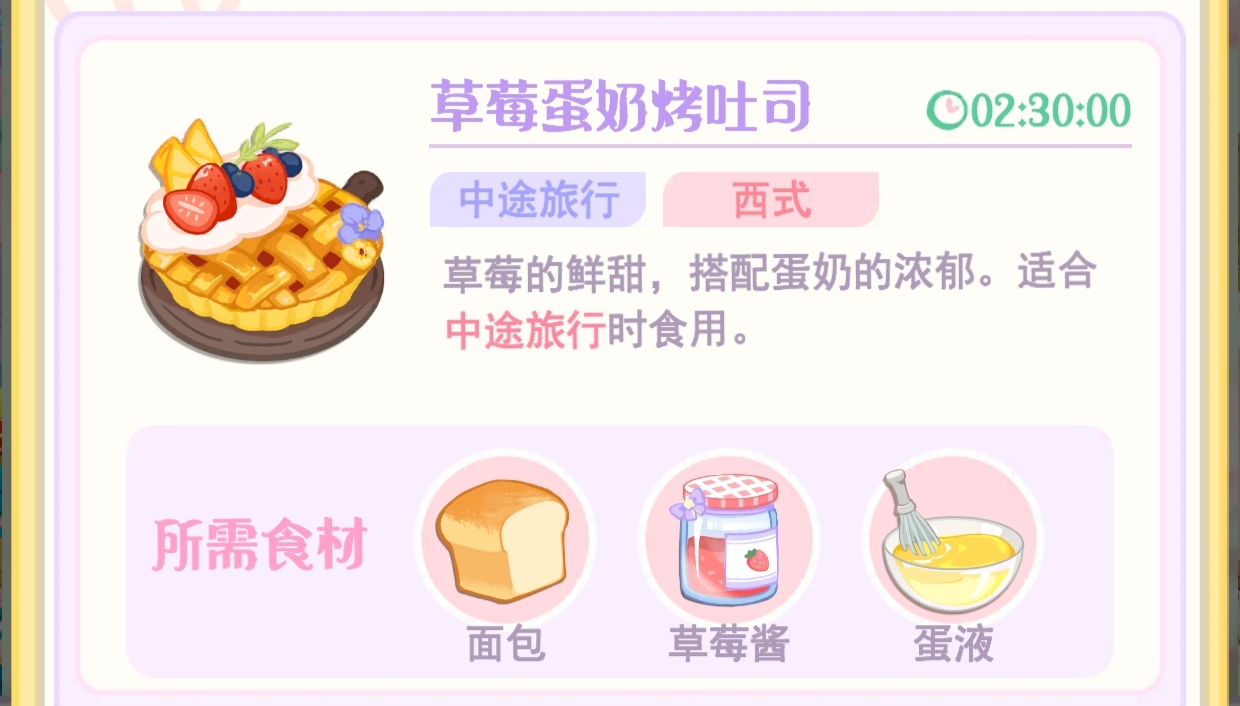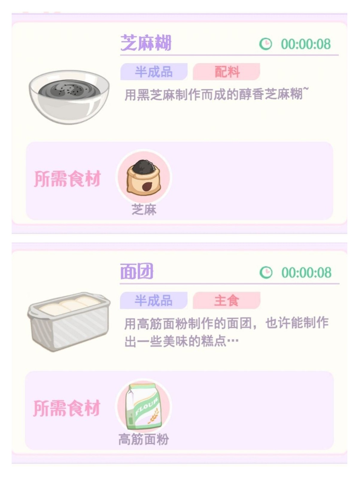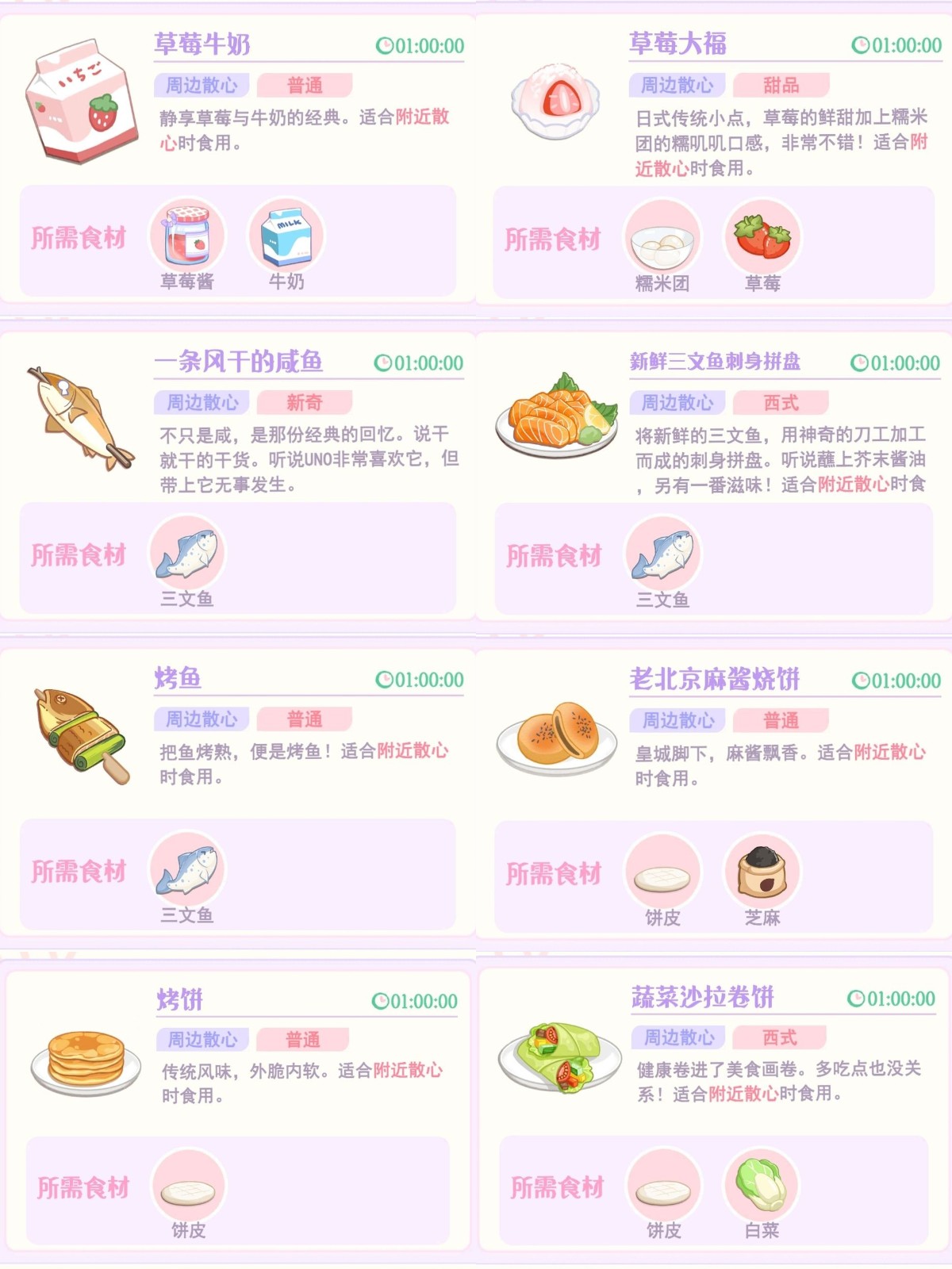 游戏中提供了多种不同的菜谱,包括半成品和完整料理。半成品是指不能直接携带,需要二次加工的食物;而完整料理则可以给角色带上。需要注意的是,烹饪一次可能需要数小时,并且某些食材会用到半成品。