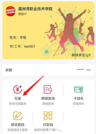 1、在易校园页面中,我们确保在绑定卡后点击右上角的充值,进入充值页面。