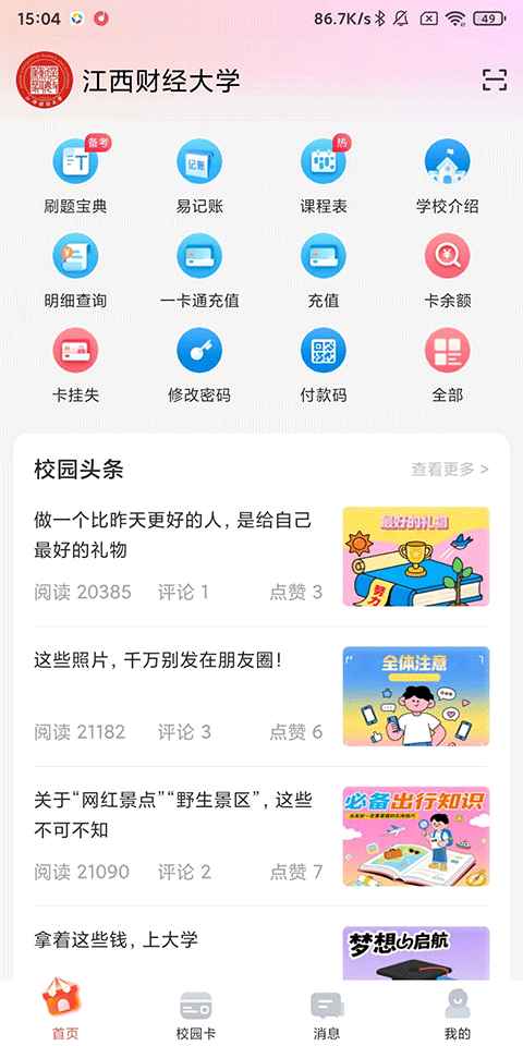 易校园最新版本是一款专门为大学生提供便利服务的app,简单的操作界面,好看的活泼的画面设计,优先下载,倍有面子!而且app中的功能也是非常好用的,校园卡余额查询,校园宿舍的水电费等等都是可以在这个上面交的。更有教务处的课程安排,快速查看自己班级的课程!