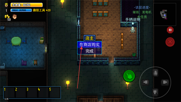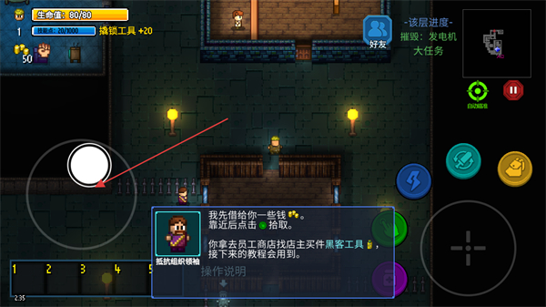 2、使用左侧虚拟摇杆移动角色,在地图中探索,寻找任务目标和商店。