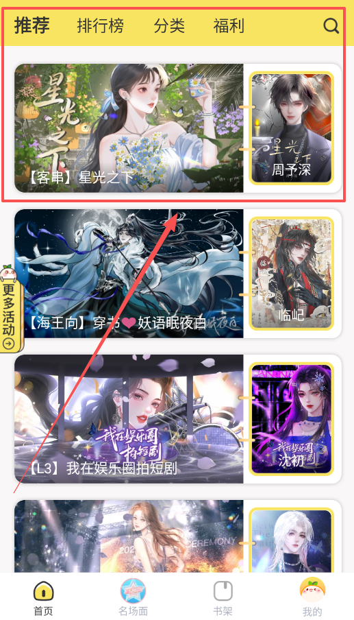 2、首页推荐与活动参与方式,打开软件默认进入推荐页,这里能看到排行榜分类和福利专区。