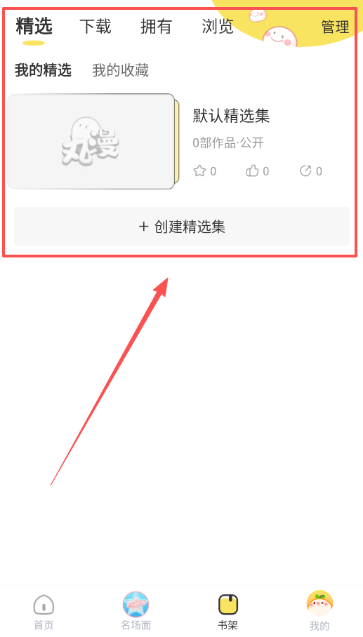 4、书架管理与精选集创建,进入书架页面后可见精选下载等分类标签,浏览记录则保存在浏览标签里方便续读呢。