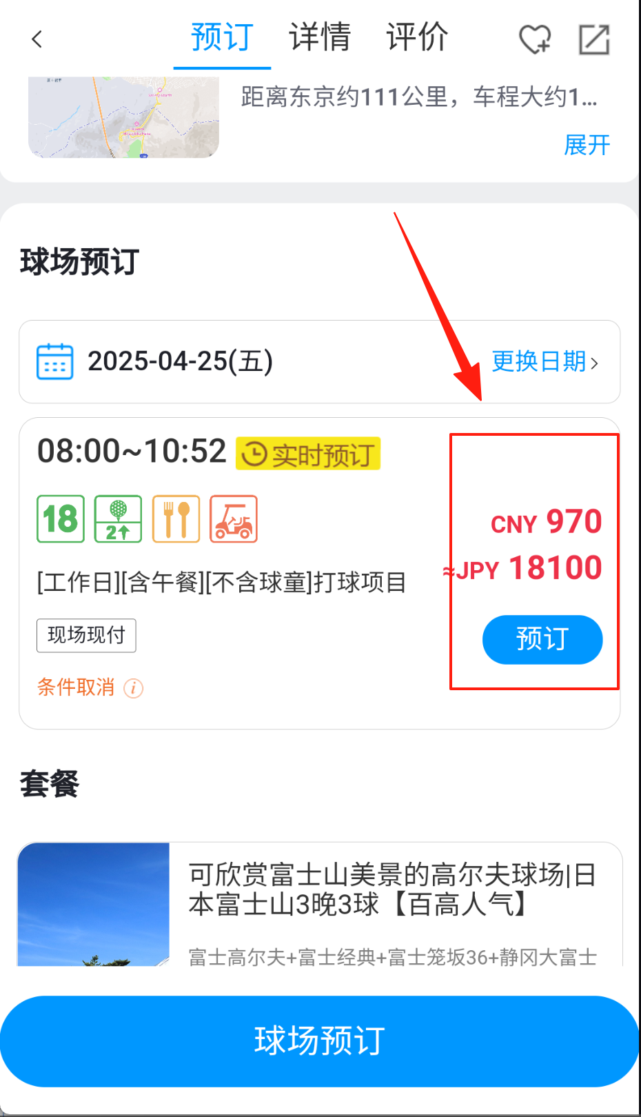 1、打开百高APP后先选择目的地城市,系统会显示该区域所有合作球场,点击心仪球场就能查看详细档期和价格啦。