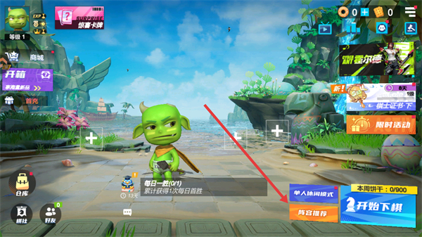 1、进入游戏主界面后,点击阵容推荐选项,进入阵容推荐界面。