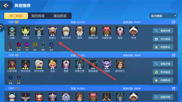 2、在阵容推荐界面中,选择想要收藏的阵容,如热门阵容中的某一阵容,点击查看详情。